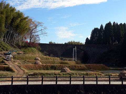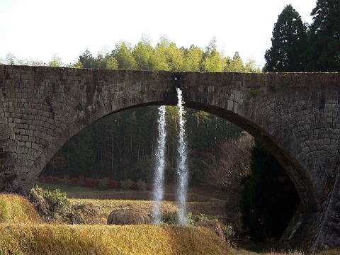 | 通潤橋。熊本県上益城郡矢部町にあり江戸時代に造られた日本最大の用水石橋。 | 運良く水が放水されていた。止まる二三分前だった。 |