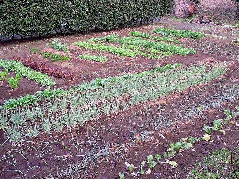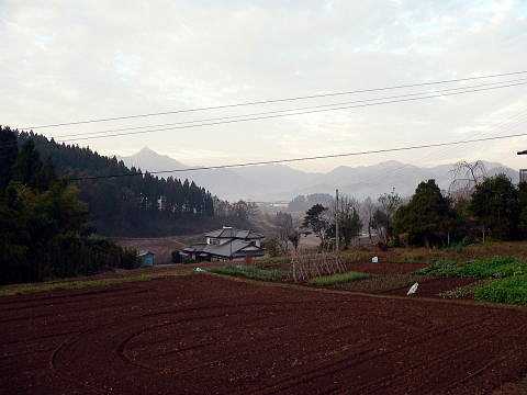 | 裏の小作園。女将さんが作る。料理の野菜はここから・・・・。 | のごころから高千穂の中心地を望む。温泉も近くにある。周りには段段畑で耕地整備したのかと思うような所で何も無いが、宿の中にはたくさんの珍しい料理があった。それもうまい!。 |