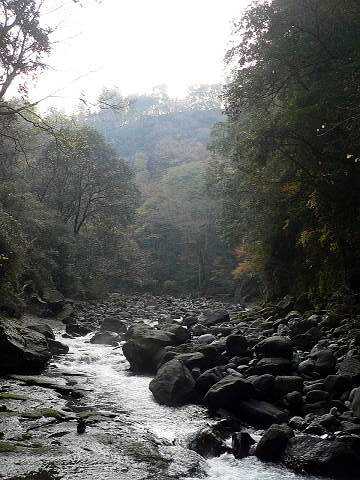 | 神々が集まり会合をする所(ほこら)だそうだ。石塔がいっぱい。 | 五ヶ瀬川支流。左の写真のすぐ右側。 |