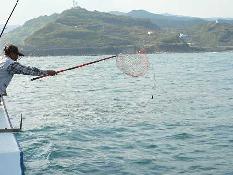| 向こう岸はサボテン園。 | Mさんにもめでたく真鯛が釣れました。 |