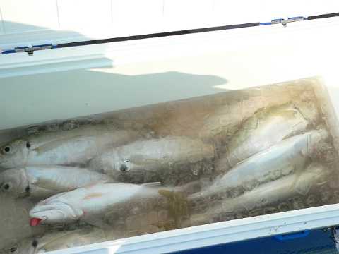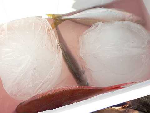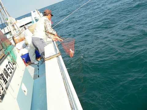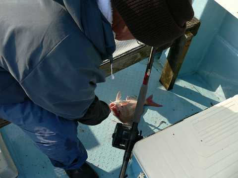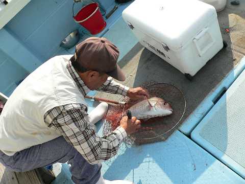 | 3k前後の真鯛が釣れた。空気を抜いてシメずに・・・・。 | 船のいけすにドッボン!。刺身に最適。 |