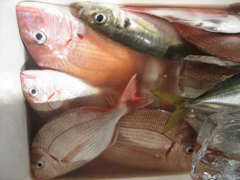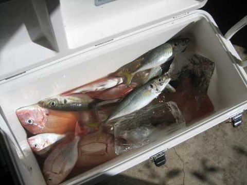 真鯛・チダイ・9尾、鯖2尾、鯵5尾、イカ2杯 | 60Lクーラーが寂しそう、残念! |